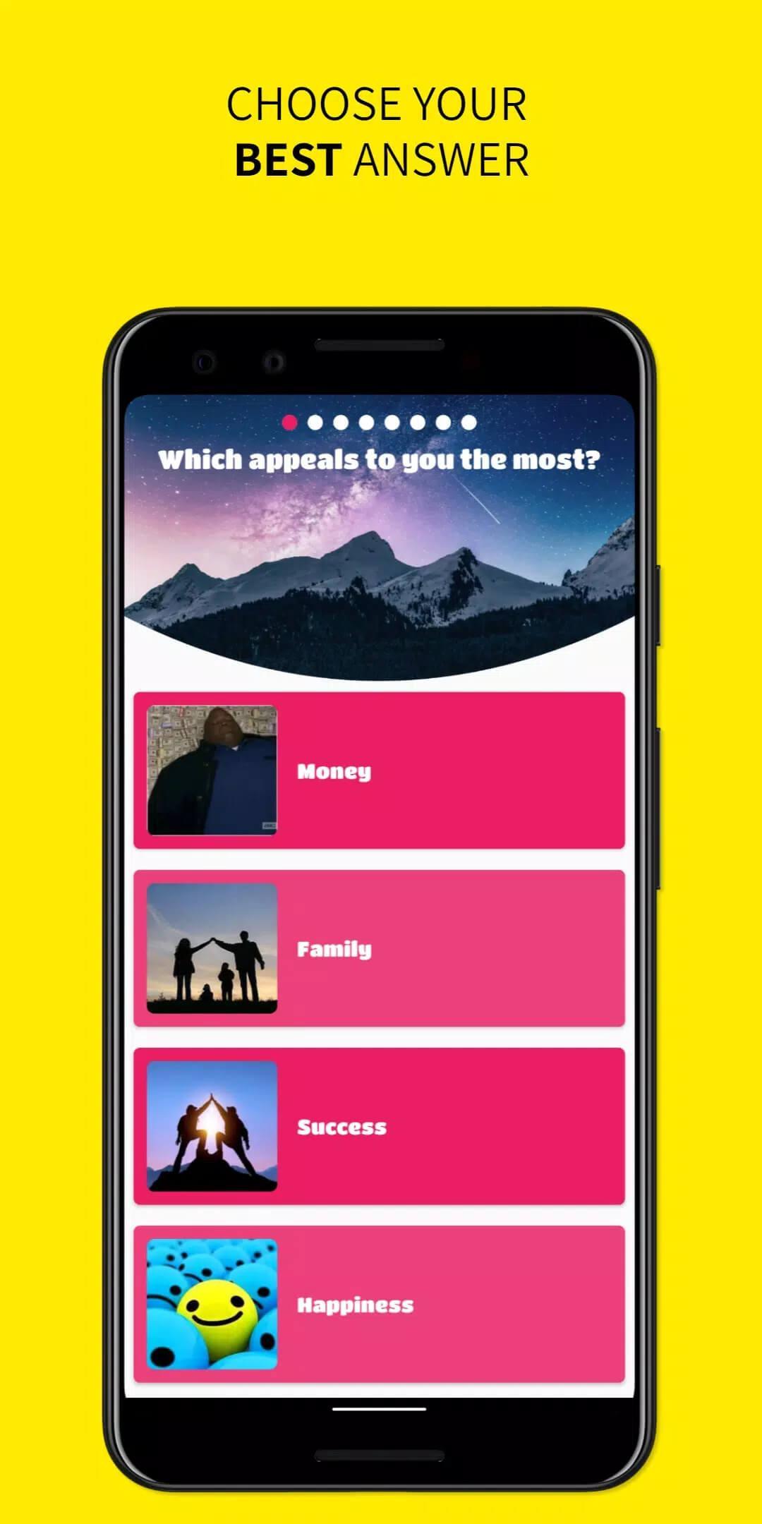 Do you know what your spirit animal is? Now you have the chance to find out with this application. It features a set of questions to choose from such as fruit, drink, wood, and fish. Each of the questions provides three different choices.